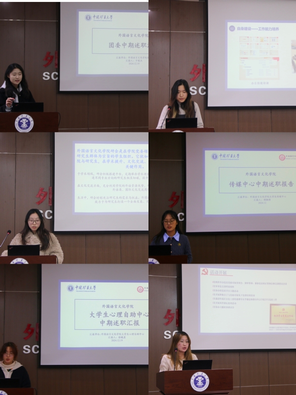 会上,院团委、学生会、研究生会、大学生传媒中心、大学生心理自助中心和学生党员工作站负责人围绕组织建设、活动开展、总结反思等方面,依次作述职工作报告。