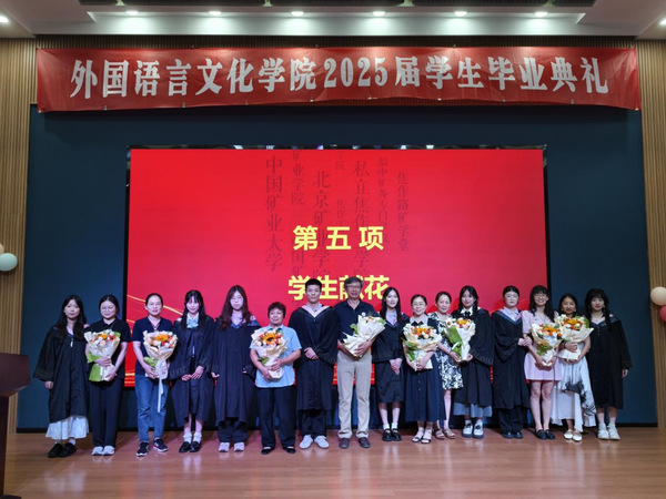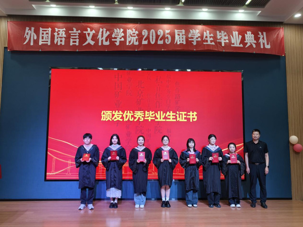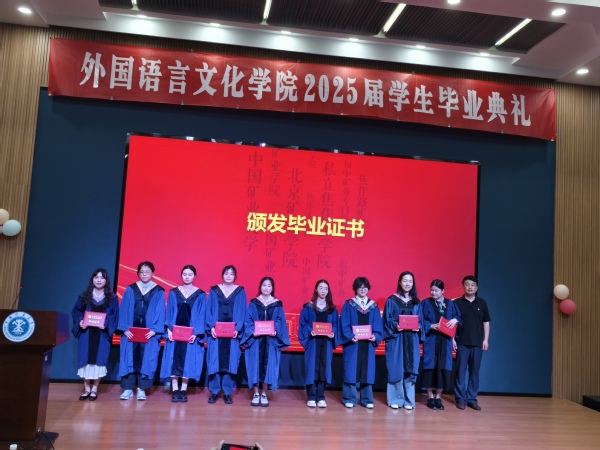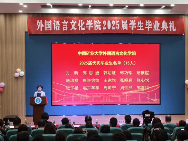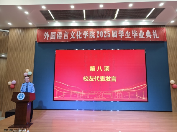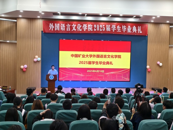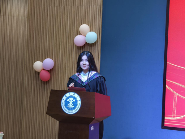 在代表发言环节,教师代表刘会民鼓励毕业生们以语言为舟,文化为帆,用卓越的沟通能力架设中外交流的桥梁,自信驶向广阔的世界舞台。校友代表王善翌分享了他的职场经历,强调专业跨界、团队协作与终身学习的重要性,寄语学弟学妹永葆活力、敢于创新、勇于超越。宿舍管理员李贵华殷切叮嘱学子们离校独立生活学会照顾自己,珍惜同窗情谊继续保持联系,不忘母校培养常怀感恩之心。研究生毕业生郭思婕、本科生毕业生英语专业唐许锦怡、德语专业张子杨,衷心感谢母校培养与恩师教诲,难忘在矿大埋头科研、勤学奋进的点点滴滴,矿大赋予的知识与信念,积蓄为迎接未来挑战的勇气。